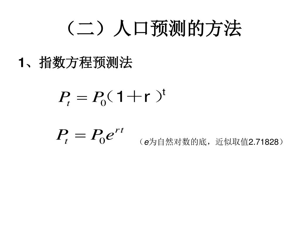 (二)人口预测的方法 1、指数方程预测法 (e为自然对数的底,近似取值2.71828)