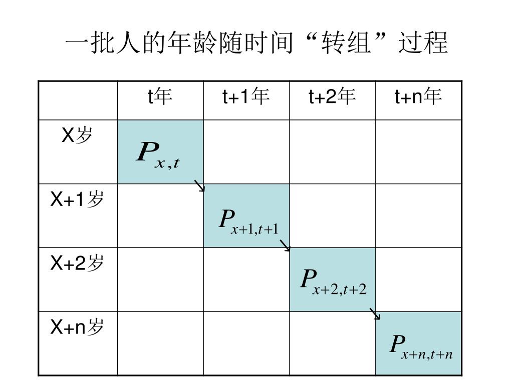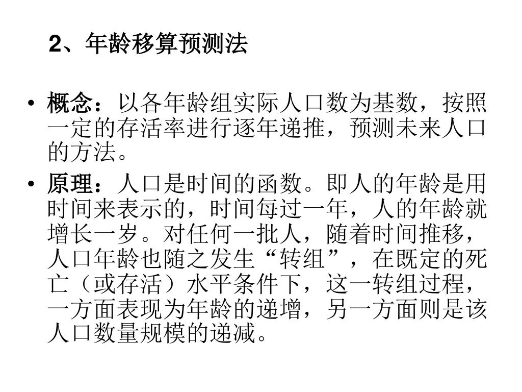 2、年龄移算预测法 • 概念:以各年龄组实际人口数为基数,按照一定的存活率进行逐年递推,预测未来人口的方法。 • 原理:人口是时间的函数。即人的年龄是用时间来表示的,时间每过一年,人的年龄就增长一岁。对任何一批人,随着时间推移,人口年龄也随之发生“转组”,在既定的死亡(或存活)水平条件下,这一转组过程,一方面表现为年龄的递增,另一方面则是该人口数量规模的递减。
