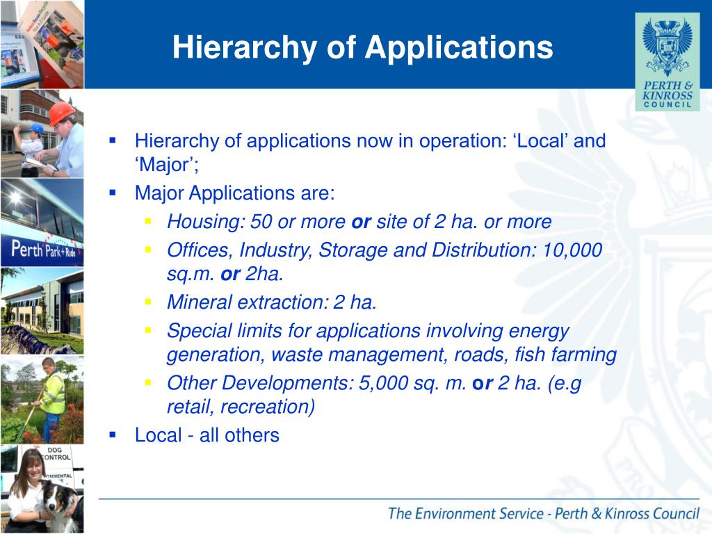 Hierarchy of Applications • Hierarchy of applications now in operation: ‘Local’ and ‘Major’; • Major Applications are: • Housing: 50 or more or site of 2 ha. or more • Offices, Industry, Storage and Distribution: 10,000 sq.m. or 2ha. • Mineral extraction: 2 ha. • Special limits for applications involving energy generation, waste management, roads, fish farming • Other Developments: 5,000 sq. m. or 2 ha. (e.g retail, recreation) • Local - all others