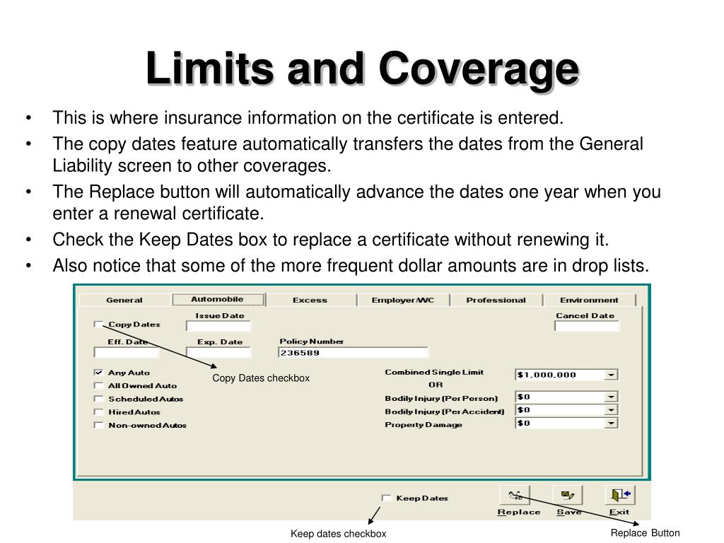 Limits and Coverage • This is where insurance information on the certificate is entered. • The copy dates feature automatically transfers the dates from the General Liability screen to other coverages. • The Replace button will automatically advance the dates one year when you enter a renewal certificate. • Check the Keep Dates box to replace a certificate without renewing it. • Also notice that some of the more frequent dollar amounts are in drop lists. Copy Dates checkbox ReplaceButton Keep dates checkbox
