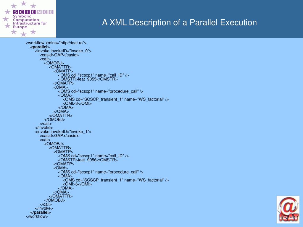 A XML Description of a Parallel Execution <workflow xmlns="http://ieat.ro"> <parallel> <invoke invokeID="invoke_0"> <casid>GAP</casid> <call> <OMOBJ> <OMATTR> <OMATP> <OMS cd="scscp1" name="call_ID" /> <OMSTR>ieat_9055</OMSTR> </OMATP> <OMA> <OMS cd="scscp1" name="procedure_call" /> <OMA> <OMS cd="SCSCP_transient_1" name="WS_factorial" /> <OMI>3</OMI> </OMA> </OMA> </OMATTR> </OMOBJ> </call> </invoke> <invoke invokeID="invoke_1"> <casid>GAP</casid> <call> <OMOBJ> <OMATTR> <OMATP> <OMS cd="scscp1" name="call_ID" /> <OMSTR>ieat_9056</OMSTR> </OMATP> <OMA> <OMS cd="scscp1" name="procedure_call" /> <OMA> <OMS cd="SCSCP_transient_1" name="WS_factorial" /> <OMI>6</OMI> </OMA> </OMA> </OMATTR> </OMOBJ> </call> </invoke> </parallel> </workflow>