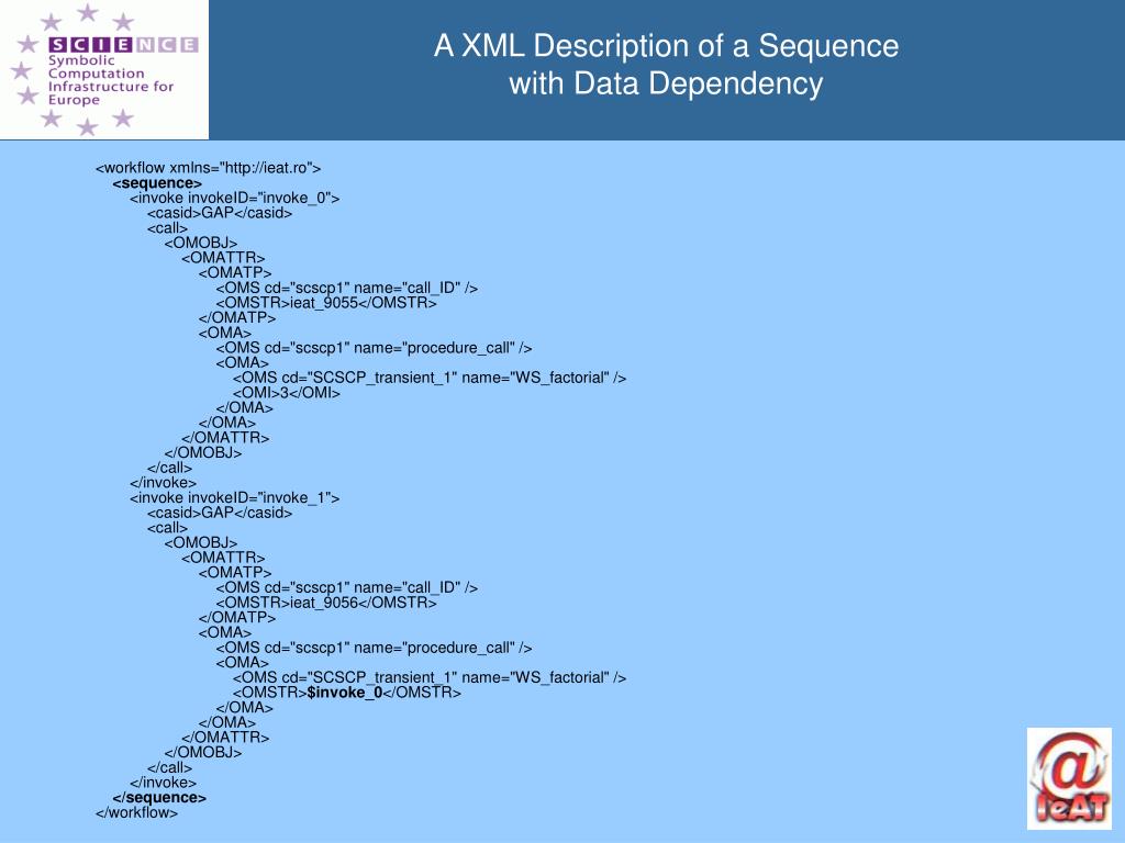 A XML Description of a Sequencewith Data Dependency <workflow xmlns="http://ieat.ro"> <sequence> <invoke invokeID="invoke_0"> <casid>GAP</casid> <call> <OMOBJ> <OMATTR> <OMATP> <OMS cd="scscp1" name="call_ID" /> <OMSTR>ieat_9055</OMSTR> </OMATP> <OMA> <OMS cd="scscp1" name="procedure_call" /> <OMA> <OMS cd="SCSCP_transient_1" name="WS_factorial" /> <OMI>3</OMI> </OMA> </OMA> </OMATTR> </OMOBJ> </call> </invoke> <invoke invokeID="invoke_1"> <casid>GAP</casid> <call> <OMOBJ> <OMATTR> <OMATP> <OMS cd="scscp1" name="call_ID" /> <OMSTR>ieat_9056</OMSTR> </OMATP> <OMA> <OMS cd="scscp1" name="procedure_call" /> <OMA> <OMS cd="SCSCP_transient_1" name="WS_factorial" /> <OMSTR>$invoke_0</OMSTR> </OMA> </OMA> </OMATTR> </OMOBJ> </call> </invoke> </sequence> </workflow>