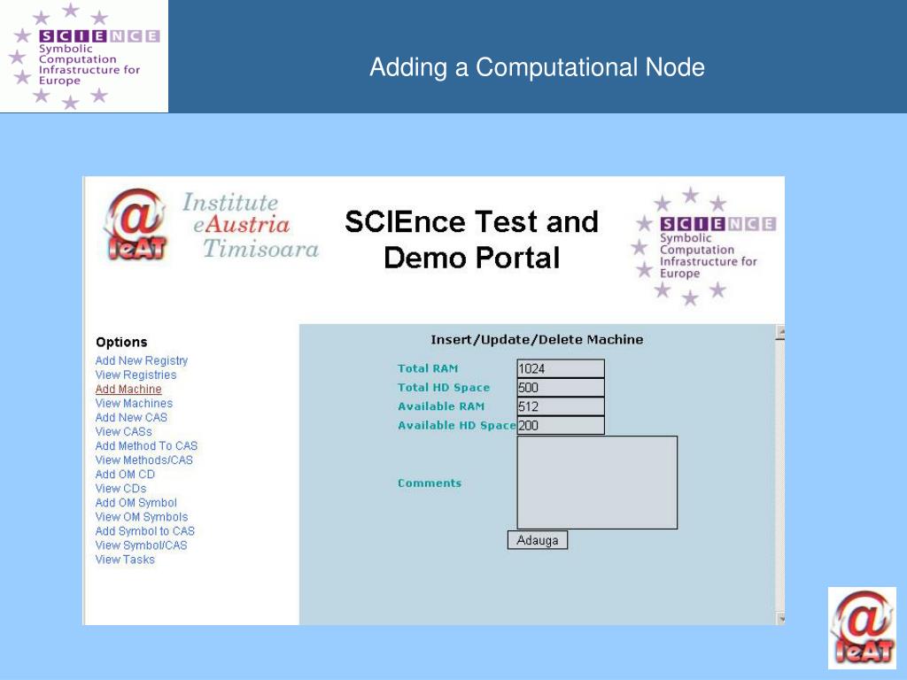 CAS Server Setup In order to expose and advertise the functionality of a CAS server, the administrator must: • Describe the computational capabilities of the computational node • Add to the Local Registry the names and details regarding any Methods/OM Symbols that must are going to be exposed • Specify which CAS(GAP, Maple, etc..) supports the functionality • Add to the Local Registry detail about the Main Registries that the current Local Registry will advertise in. • Choose which for every method/symbol that should be exposed the Main Registries to advertise in.
