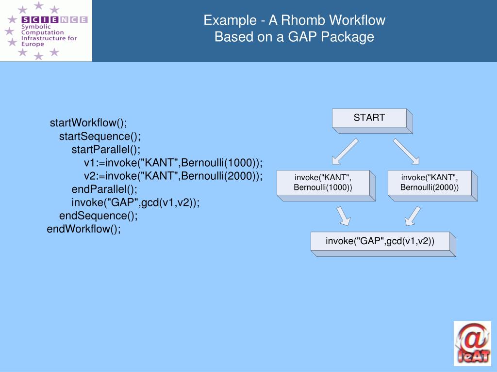 Example - A Rhomb WorkflowBased on a GAP Package startWorkflow(); startSequence(); startParallel(); v1:=invoke("KANT",Bernoulli(1000)); v2:=invoke("KANT",Bernoulli(2000)); endParallel(); invoke("GAP",gcd(v1,v2)); endSequence(); endWorkflow();