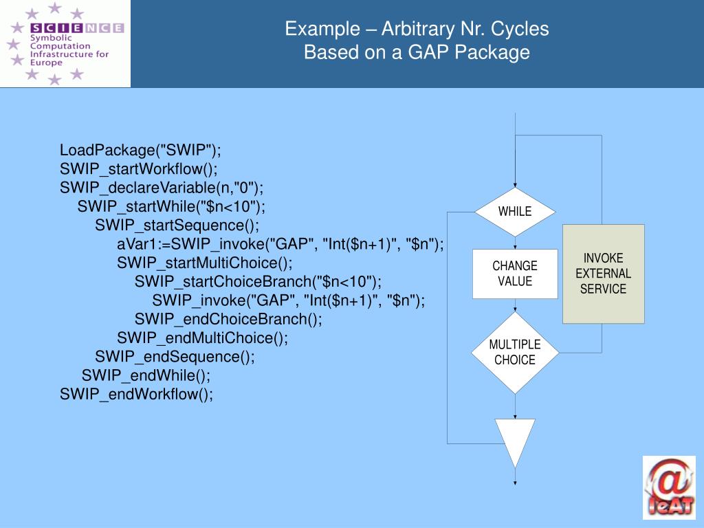 Example – Arbitrary Nr. CyclesBased on a GAP Package LoadPackage("SWIP"); SWIP_startWorkflow(); SWIP_declareVariable(n,"0"); SWIP_startWhile("$n<10"); SWIP_startSequence(); aVar1:=SWIP_invoke("GAP", "Int($n+1)", "$n"); SWIP_startMultiChoice(); SWIP_startChoiceBranch("$n<10"); SWIP_invoke("GAP", "Int($n+1)", "$n"); SWIP_endChoiceBranch(); SWIP_endMultiChoice(); SWIP_endSequence(); SWIP_endWhile(); SWIP_endWorkflow();