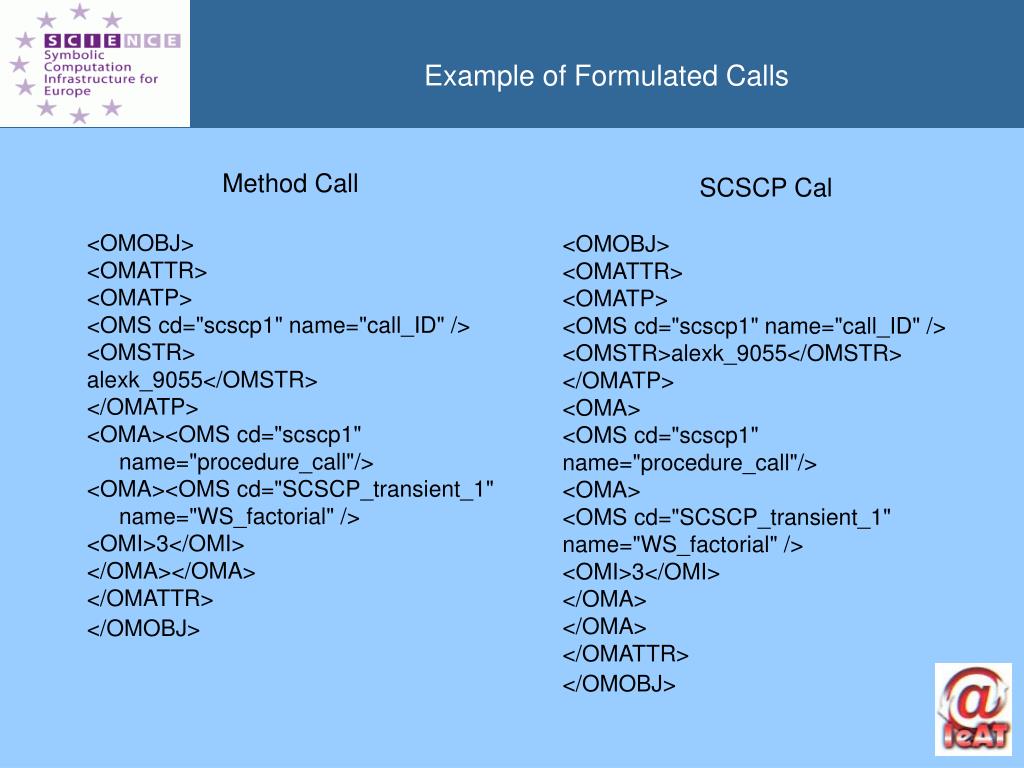 Example of Formulated Calls Method Call <OMOBJ> <OMATTR> <OMATP> <OMS cd="scscp1" name="call_ID" /> <OMSTR> alexk_9055</OMSTR> </OMATP> <OMA><OMS cd="scscp1" name="procedure_call"/> <OMA><OMS cd="SCSCP_transient_1" name="WS_factorial" /> <OMI>3</OMI> </OMA></OMA> </OMATTR> </OMOBJ> SCSCP Cal <OMOBJ> <OMATTR> <OMATP> <OMS cd="scscp1" name="call_ID" /> <OMSTR>alexk_9055</OMSTR> </OMATP> <OMA> <OMS cd="scscp1" name="procedure_call"/> <OMA> <OMS cd="SCSCP_transient_1" name="WS_factorial" /> <OMI>3</OMI> </OMA> </OMA> </OMATTR> </OMOBJ>