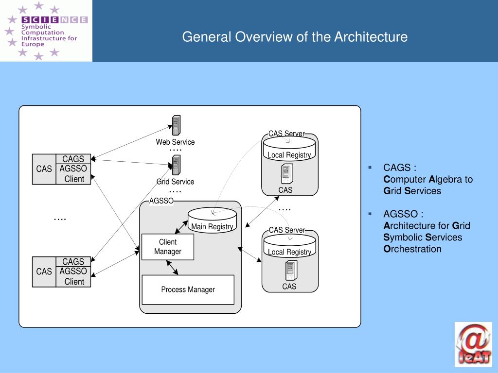General Overview of the Architecture • CAGS : Computer Algebra to Grid Services • AGSSO : Architecture for Grid Symbolic Services Orchestration