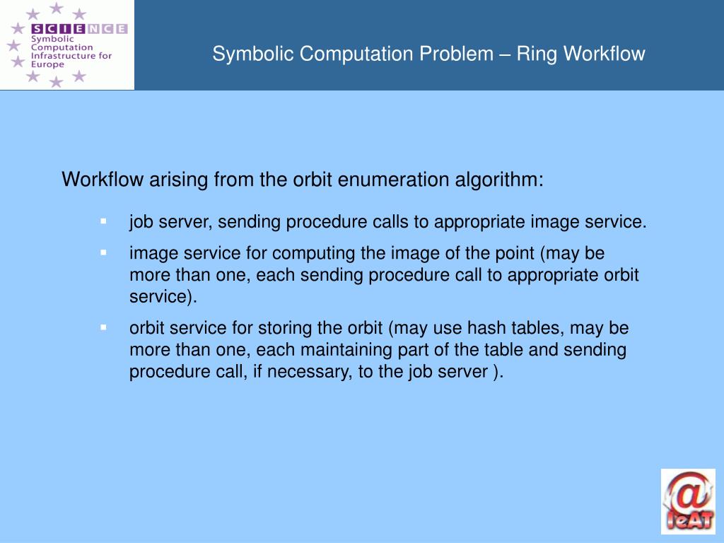 Symbolic Computation Problem – Ring Workflow Workflow arising from the orbit enumeration algorithm: • job server, sending procedure calls to appropriate image service. • image service for computing the image of the point (may be more than one, each sending procedure call to appropriate orbit service). • orbit service for storing the orbit (may use hash tables, may be more than one, each maintaining part of the table and sending procedure call, if necessary, to the job server ).