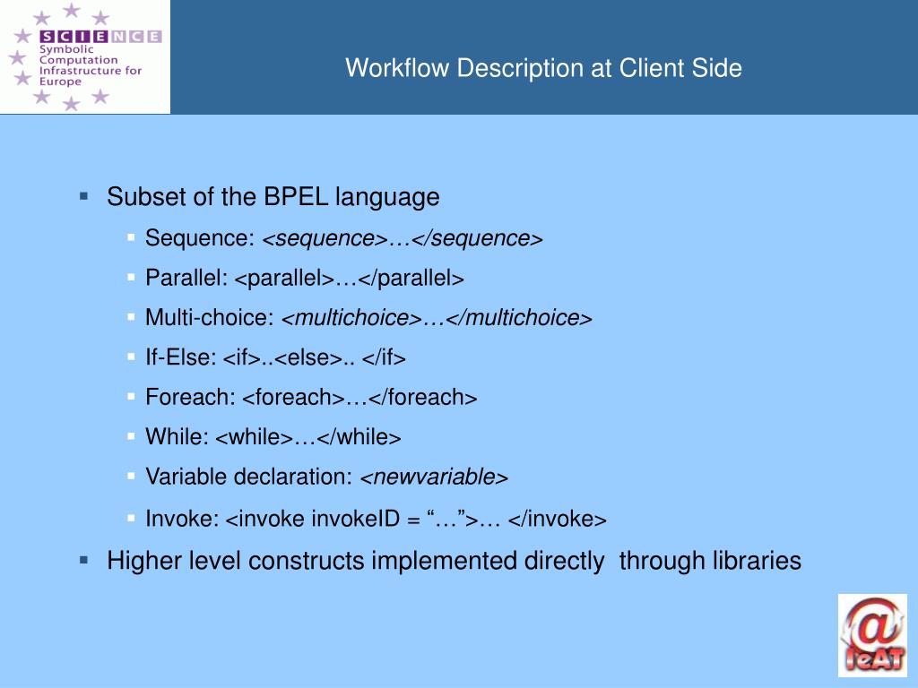 Workflow Description at Client Side • Subset of the BPEL language • Sequence: <sequence>…</sequence> • Parallel: <parallel>…</parallel> • Multi-choice: <multichoice>…</multichoice> • If-Else: <if>..<else>.. </if> • Foreach: <foreach>…</foreach> • While: <while>…</while> • Variable declaration: <newvariable> • Invoke: <invoke invokeID = “…”>… </invoke> • Higher level constructs implemented directly through libraries