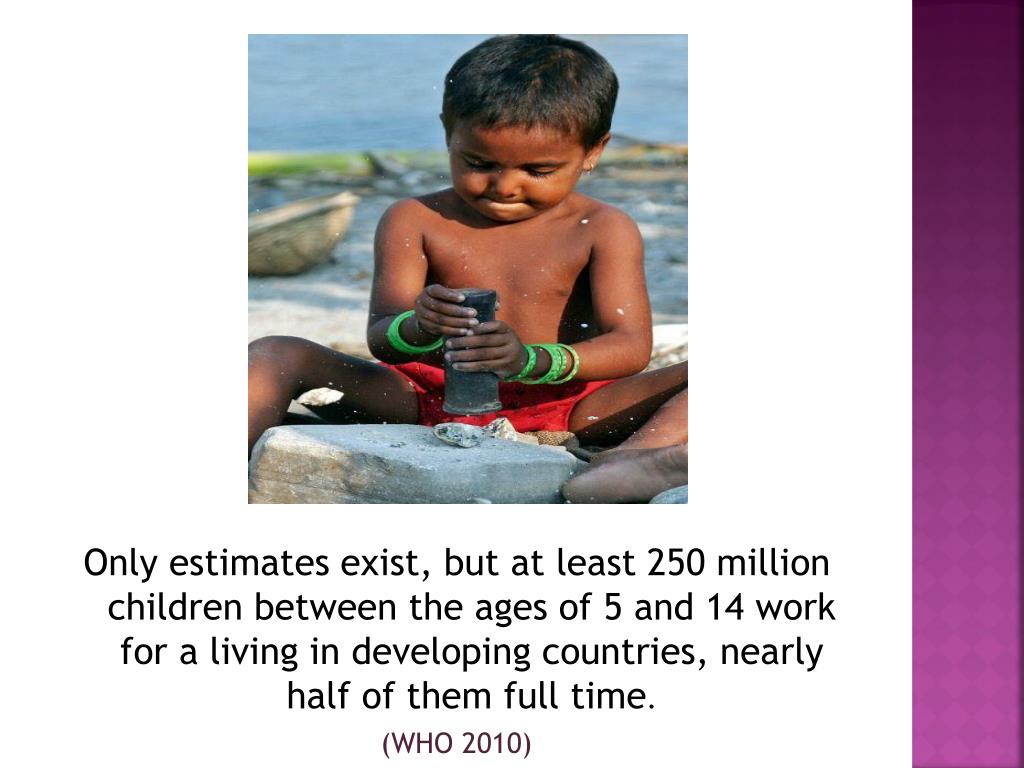 Only estimates exist, but at least 250 million children between the ages of 5 and 14 work for a living in developing countries, nearly half of them full time. (WHO 2010)