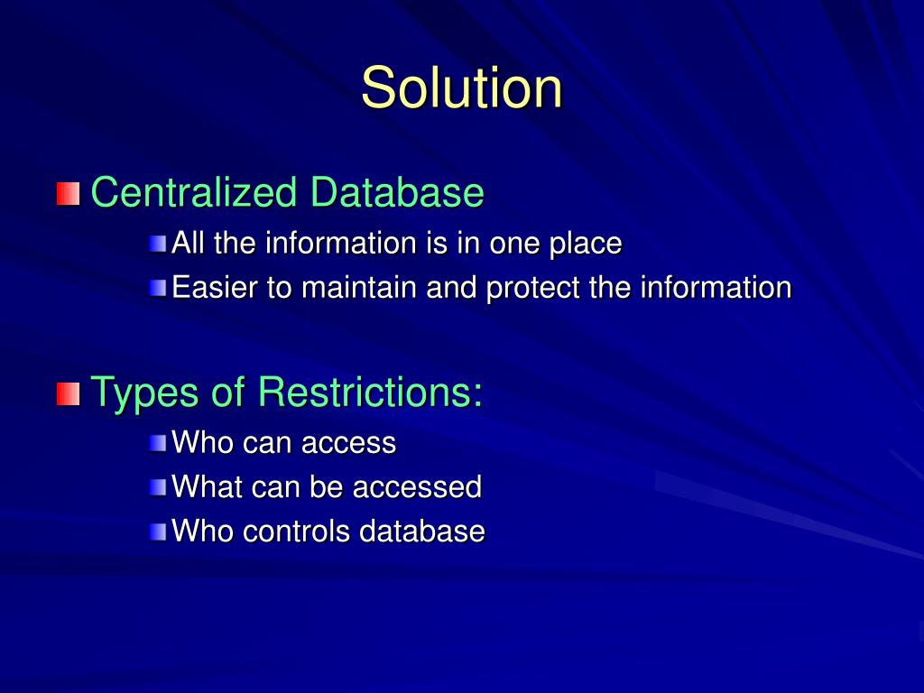 Solution • Centralized Database • All the information is in one place • Easier to maintain and protect the information • Types of Restrictions: • Who can access • What can be accessed • Who controls database