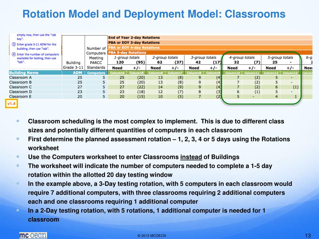 Rotation Model and Deployment Model: Classrooms v1.4 • Classroom scheduling is the most complex to implement. This is due to different class sizes and potentially different quantities of computers in each classroom • First determine the planned assessment rotation – 1, 2, 3, 4 or 5 days using the Rotations worksheet • Use the Computers worksheet to enter Classrooms instead of Buildings • The worksheet will indicate the number of computers needed to complete a 1-5 day rotation within the allotted 20 day testing window • In the example above, a 3-Day testing rotation, with 5 computers in each classroom would require 7 additional computers, with three classrooms requiring 2 additional computers each and one classrooms requiring 1 additional computer • In a 2-Day testing rotation, with 5 rotations, 1 additional computer is needed for 1 classroom