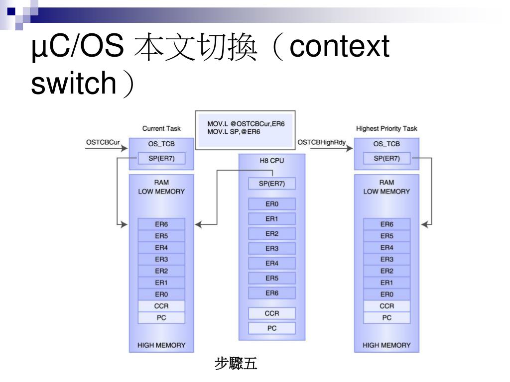 µC/OS-II’s Task Control Block 資料結構 typedef struct os_tcb { OS_STK *OSTCBStkPtr; #if OS_TASK_CREATE_EXT_EN void *OSTCBExtPtr; OS_STK *OSTCBStkBottom; INT32U OSTCBStkSize; INT16U OSTCBOpt; INT16U OSTCBId; #endif struct os_tcb *OSTCBNext; struct os_tcb *OSTCBPrev; #if (OS_Q_EN && (OS_MAX_QS >= 2)) || OS_MBOX_EN || OS_SEM_EN OS_EVENT *OSTCBEventPtr; #endif #if (OS_Q_EN && (OS_MAX_QS >= 2)) || OS_MBOX_ EN void *OSTCBMsg; #endif INT16U OSTCBDly; INT8U OSTCBStat; INT8U OSTCBPrio; INT8U OSTCBX; INT8U OSTCBY; INT8U OSTCBBitX INT8U OSTCBBitY; #if OS_TASK_DEL_EN BOOLEAN OSTCBDelReq; #endif } OS_TCB;