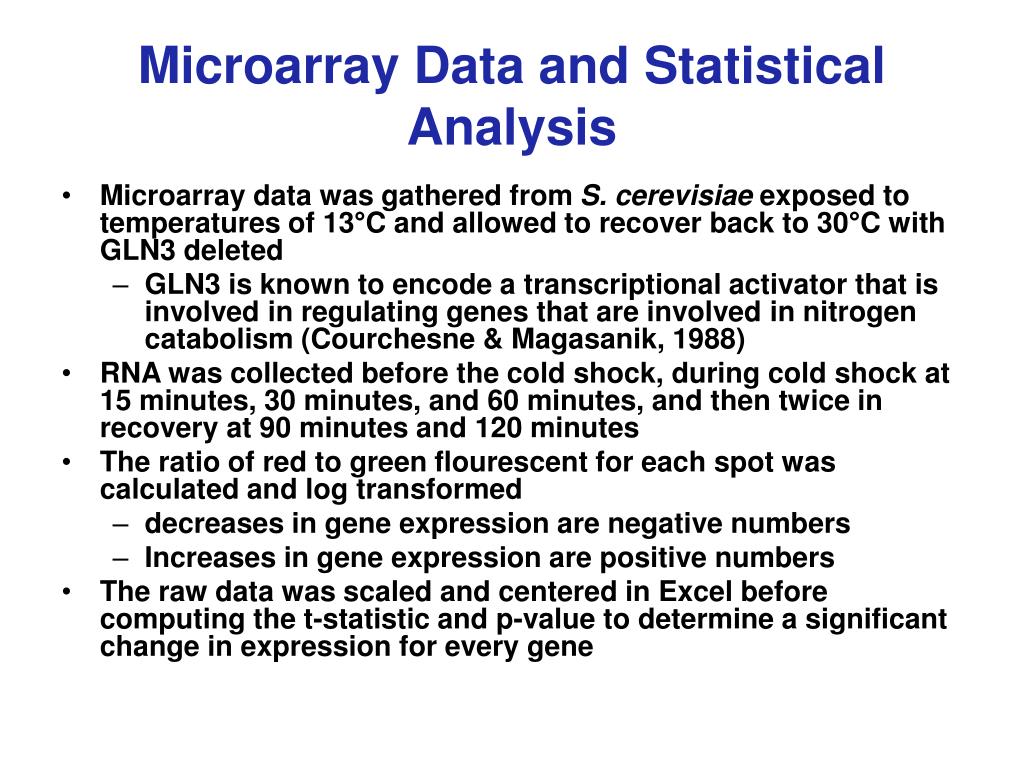 Microarray Data and Statistical Analysis • Microarray data was gathered from S. cerevisiaeexposed to temperatures of 13°C and allowed to recover back to 30°C with GLN3 deleted • GLN3 is known to encode a transcriptional activator that is involved in regulating genes that are involved in nitrogen catabolism (Courchesne & Magasanik, 1988) • RNA was collected before the cold shock, during cold shock at 15 minutes, 30 minutes, and 60 minutes, and then twice in recovery at 90 minutes and 120 minutes • The ratio of red to green flourescent for each spot was calculated and log transformed • decreases in gene expression are negative numbers • Increases in gene expression are positive numbers • The raw data was scaled and centered in Excel before computing the t-statistic and p-value to determine a significant change in expression for every gene
