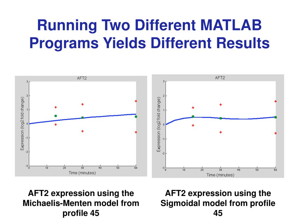 Running Two Different MATLAB Programs Yields Different Results AFT2 expression using the Michaelis-Menten model from profile 45 AFT2 expression using the Sigmoidal model from profile 45
