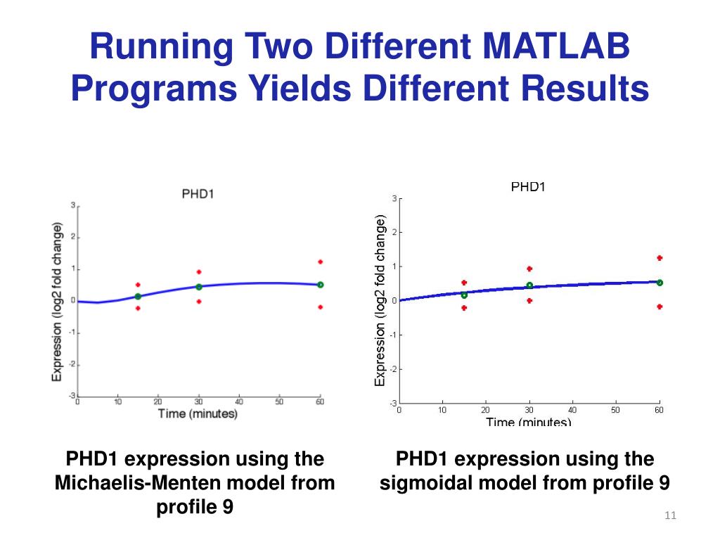Running Two Different MATLAB Programs Yields Different Results PHD1 expression using the Michaelis-Menten model from profile 9 PHD1 expression using the sigmoidal model from profile 9