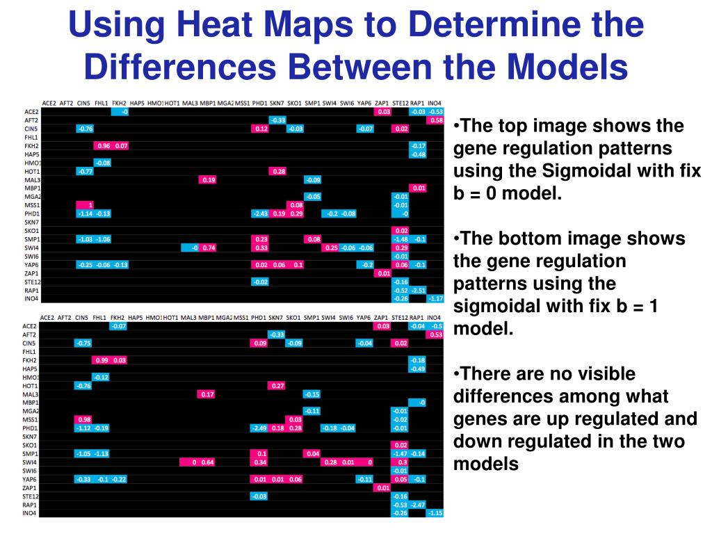 Using Heat Maps to Determine the Differences Between the Models • The top image shows the gene regulation patterns using the Sigmoidal with fix b = 0 model. • The bottom image shows the gene regulation patterns using the sigmoidal with fix b = 1 model. • There are no visible differences among what genes are up regulated and down regulated in the two models