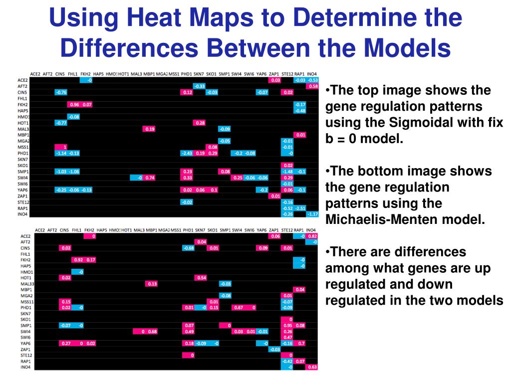 Using Heat Maps to Determine the Differences Between the Models • The top image shows the gene regulation patterns using the Sigmoidal with fix b = 0 model. • The bottom image shows the gene regulation patterns using the Michaelis-Menten model. • There are differences among what genes are up regulated and down regulated in the two models