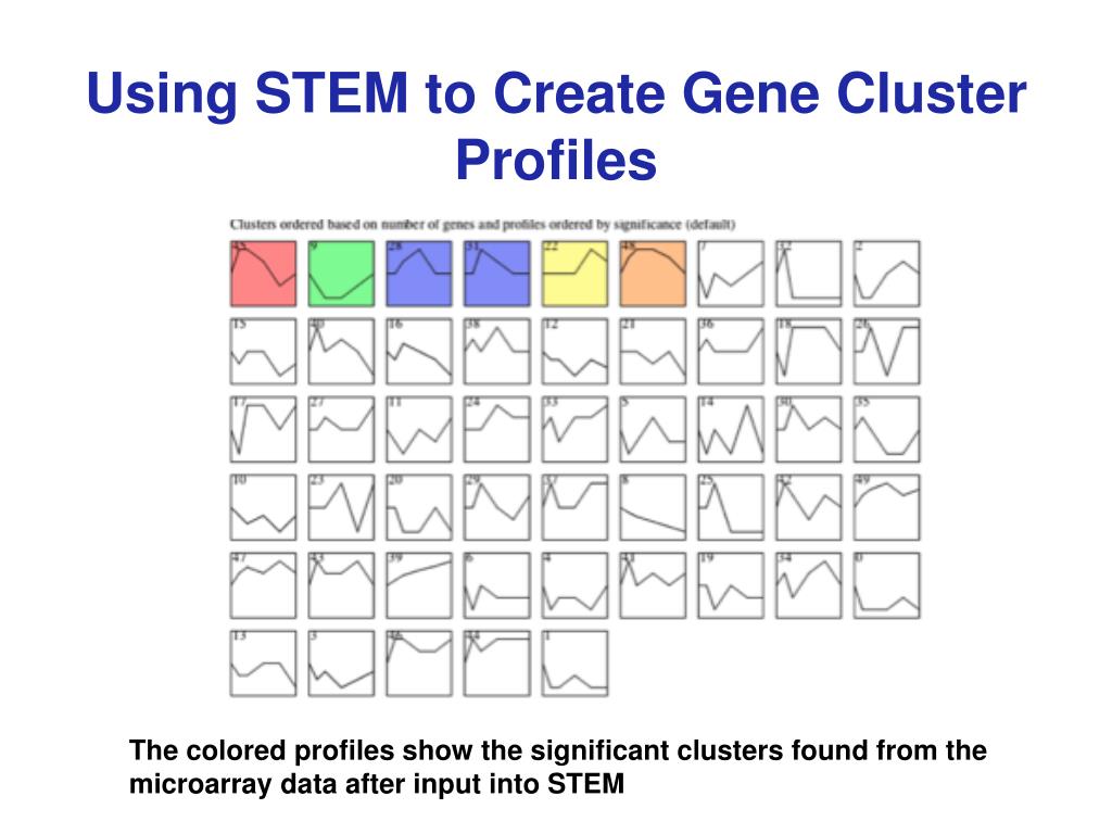Using STEM to Create Gene Cluster Profiles The colored profiles show the significant clusters found from the microarray data after input into STEM