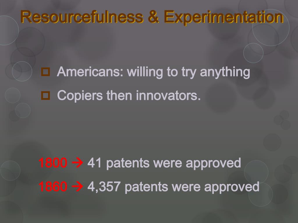 Resourcefulness & Experimentation • Americans: willing to try anything • Copiers then innovators. 1800 41 patents were approved 1860 4,357 patents were approved