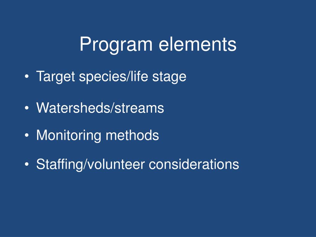 Program elements • Monitoring methods • Target species/life stage • Watersheds/streams • Staffing/volunteer considerations