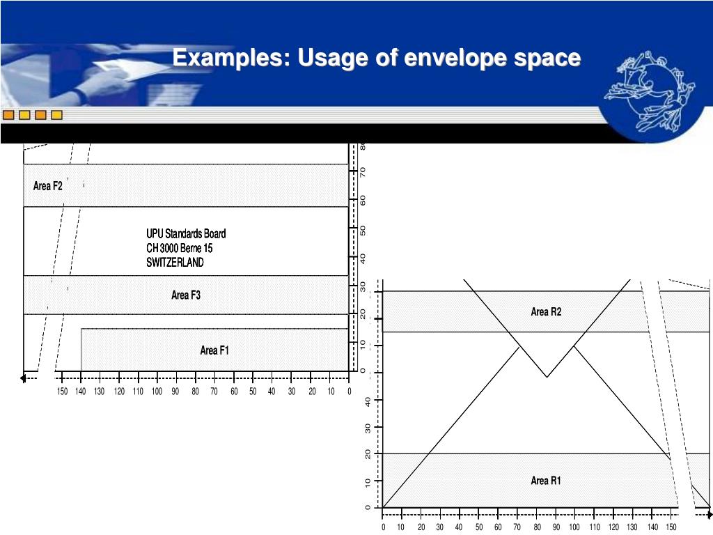 Mail Related Standards • Identification/codification of postal items, collections of mail, mail processing facilities, etc. • Bar coding applications (id tagging, franking marks, etc.) • Interfaces between Mailers/Posts (EDI messages,Tracking &Tracing capabilities, etc.) • Addressing standards