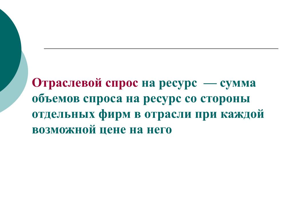 Отраслевой спрос на ресурс — сумма объемов спроса на ресурс со стороны отдельных фирм в отрасли при каждой возможной цене на него