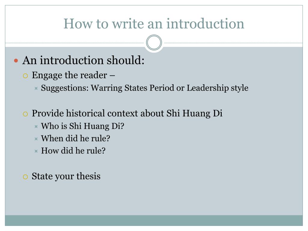 How to write an introduction • An introduction should: • Engage the reader – • Suggestions: Warring States Period or Leadership style • Provide historical context about Shi Huang Di • Who is Shi Huang Di? • When did he rule? • How did he rule? • State your thesis