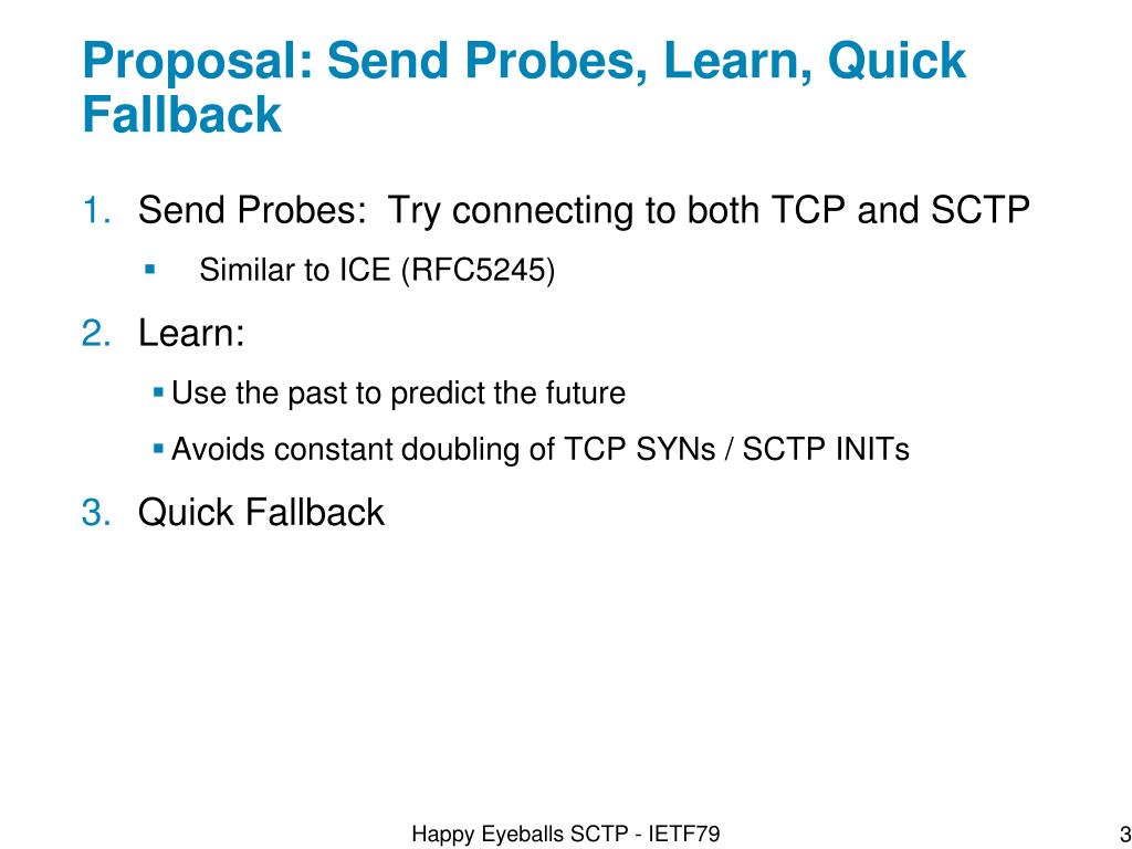Proposal: Send Probes, Learn, Quick Fallback Send Probes: Try connecting to both TCP and SCTP Similar to ICE (RFC5245) Learn: Use the past to predict the future Avoids constant doubling of TCP SYNs / SCTPINITs Quick Fallback Happy Eyeballs SCTP - IETF79