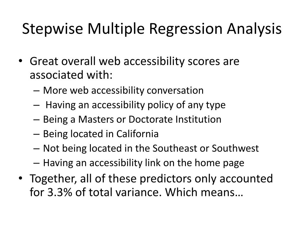 Stepwise Multiple Regression Analysis • Great overall web accessibility scores are associated with: • More web accessibility conversation • Having an accessibility policy of any type • Being a Masters or Doctorate Institution • Being located in California • Not being located in the Southeast or Southwest • Having an accessibility link on the home page • Together, all of these predictors only accounted for 3.3% of total variance. Which means…