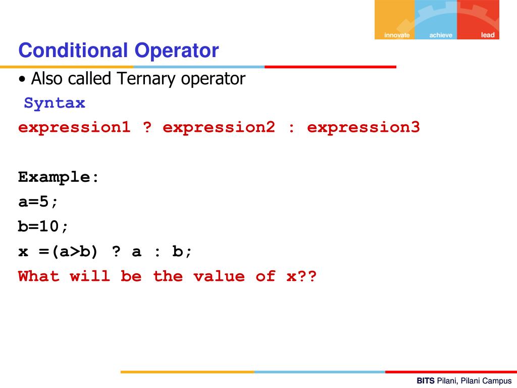 Conditional Operator • Also called Ternary operator Syntax expression1 ? expression2 : expression3 Example: a=5; b=10; x =(a>b) ? a : b; What will be the value of x??