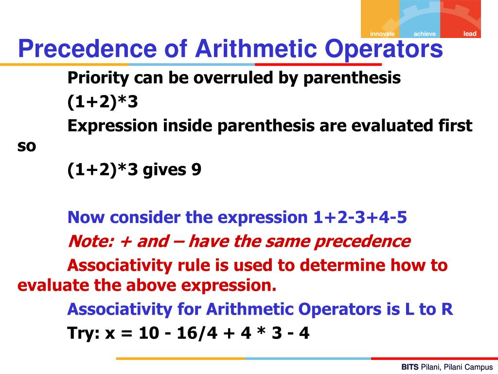 Precedence of Arithmetic Operators Priority can be overruled by parenthesis (1+2)*3 Expression inside parenthesis are evaluated first so (1+2)*3 gives 9 Now consider the expression 1+2-3+4-5 Note: + and – have the same precedence Associativity rule is used to determine how to evaluate the above expression. Associativity for Arithmetic Operators is L to R Try: x = 10 - 16/4 + 4 * 3 - 4