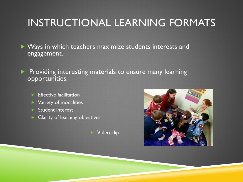Instructional learning formats • Ways in which teachers maximize students interests and engagement. • Providing interesting materials to ensure many learning opportunities. • Effective facilitation • Variety of modalities • Student interest • Clarity of learning objectives • Video clip
