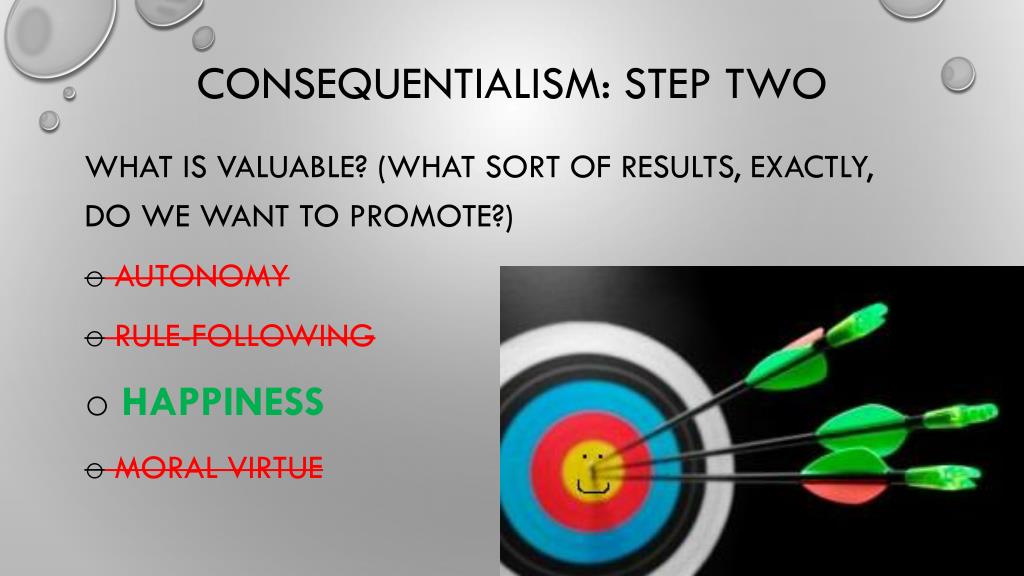 Consequentialism: step two What is valuable? (What sort of results, exactly, do we want to promote?) • autonomy • rule-following • happiness • moral virtue