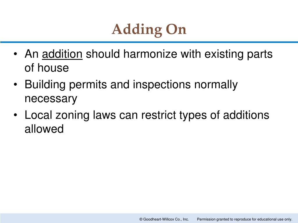 Adding On • An addition should harmonize with existing parts of house • Building permits and inspections normally necessary • Local zoning laws can restrict types of additions allowed