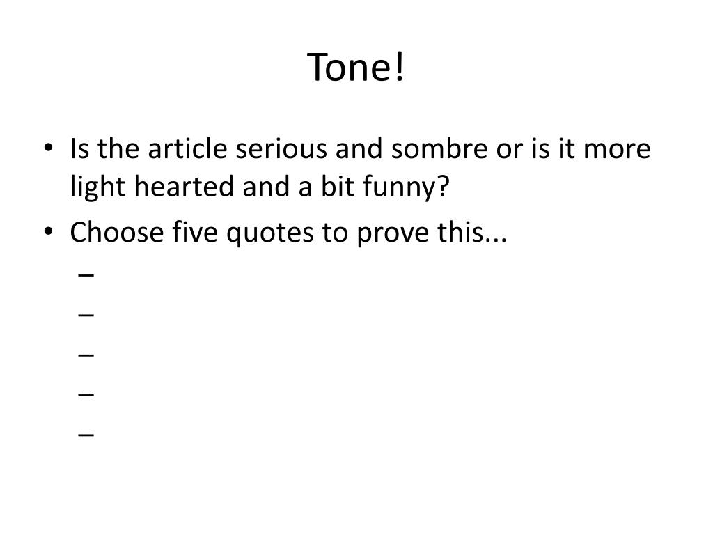 Tone! • Is the article serious and sombre or is it more light hearted and a bit funny? • Choose five quotes to prove this...