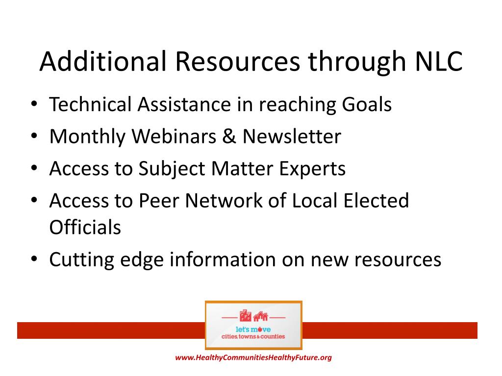 Additional Resources through NLC • Technical Assistance in reaching Goals • Monthly Webinars & Newsletter • Access to Subject Matter Experts • Access to Peer Network of Local Elected Officials • Cutting edge information on new resources www.HealthyCommunitiesHealthyFuture.org