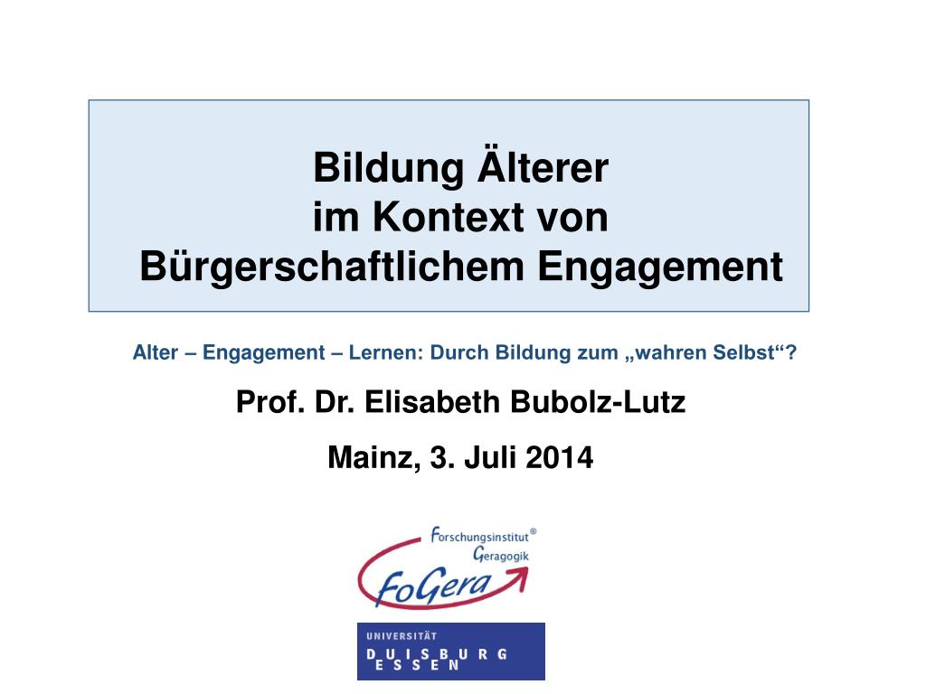 Bildung Älterer im Kontext von Bürgerschaftlichem Engagement Alter – Engagement – Lernen: Durch Bildung zum „wahren Selbst“? Prof. Dr. Elisabeth Bubolz-Lutz Mainz, 3. Juli 2014 . Übersicht. Der Hintergrund: Geragogik als Wissenschaftliche Disziplin Verständnis von Bildung