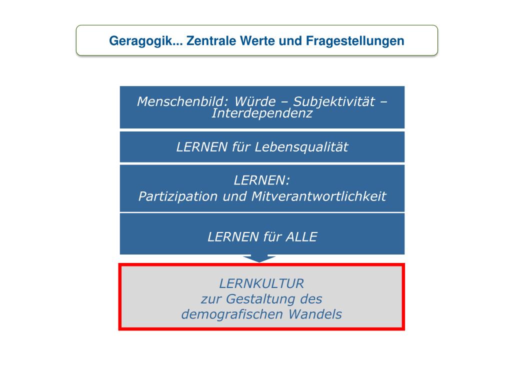 Geragogik... Zentrale Werte und Fragestellungen Menschenbild: Würde – Subjektivität – Interdependenz LERNEN für Lebensqualität LERNEN: Partizipation und Mitverantwortlichkeit LERNEN für ALLE LERNKULTUR zur Gestaltung des demografischen Wandels