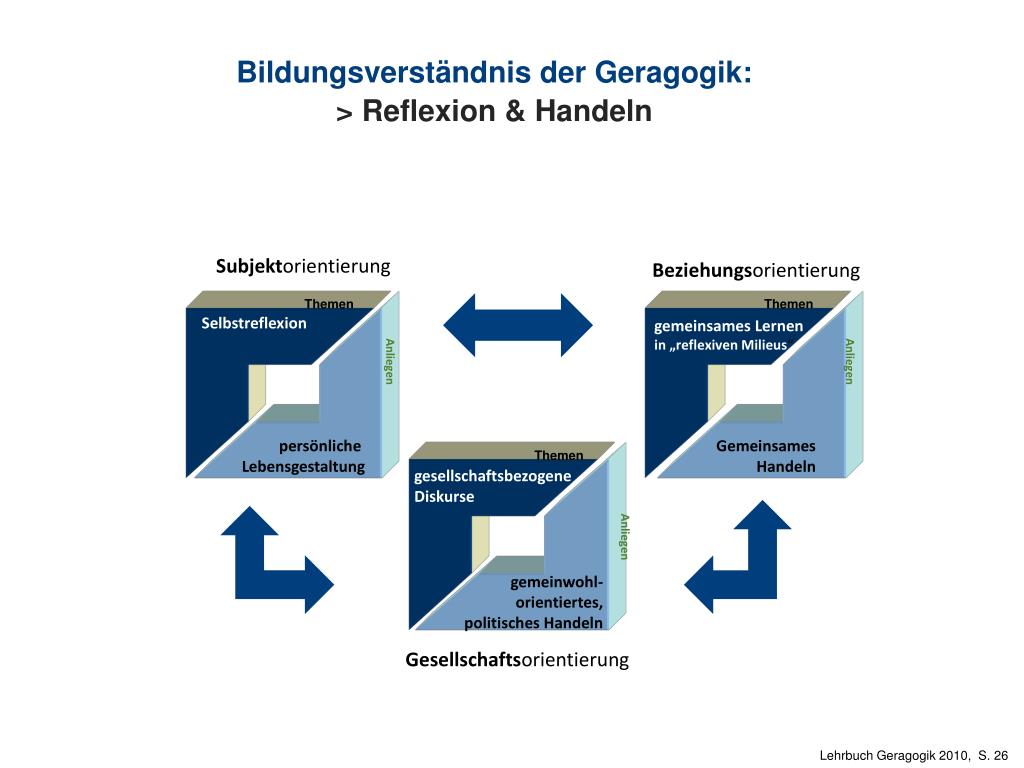 Bildungsverständnis der Geragogik: > Reflexion & Handeln • Subjektorientierung • Beziehungsorientierung Themen Themen Selbstreflexion gemeinsames Lernen in „reflexiven Milieus“ Anliegen Anliegen persönliche Lebensgestaltung Gemeinsames Handeln Themen gesellschaftsbezogene Diskurse Anliegen gemeinwohl- orientiertes, politisches Handeln • Gesellschaftsorientierung Lehrbuch Geragogik 2010, S. 26