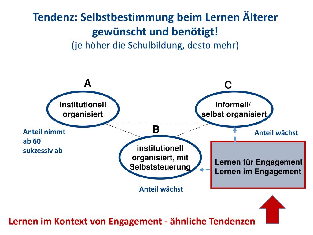Tendenz: Selbstbestimmung beim Lernen Älterer gewünscht und benötigt! (je höher die Schulbildung, desto mehr) A C institutionell organisiert informell/ selbst organisiert B Anteil nimmt ab 60 sukzessiv ab Anteil wächst institutionell organisiert, mit Selbststeuerung Lernen für Engagement Lernen im Engagement Anteil wächst Lernen im Kontext von Engagement - ähnliche Tendenzen
