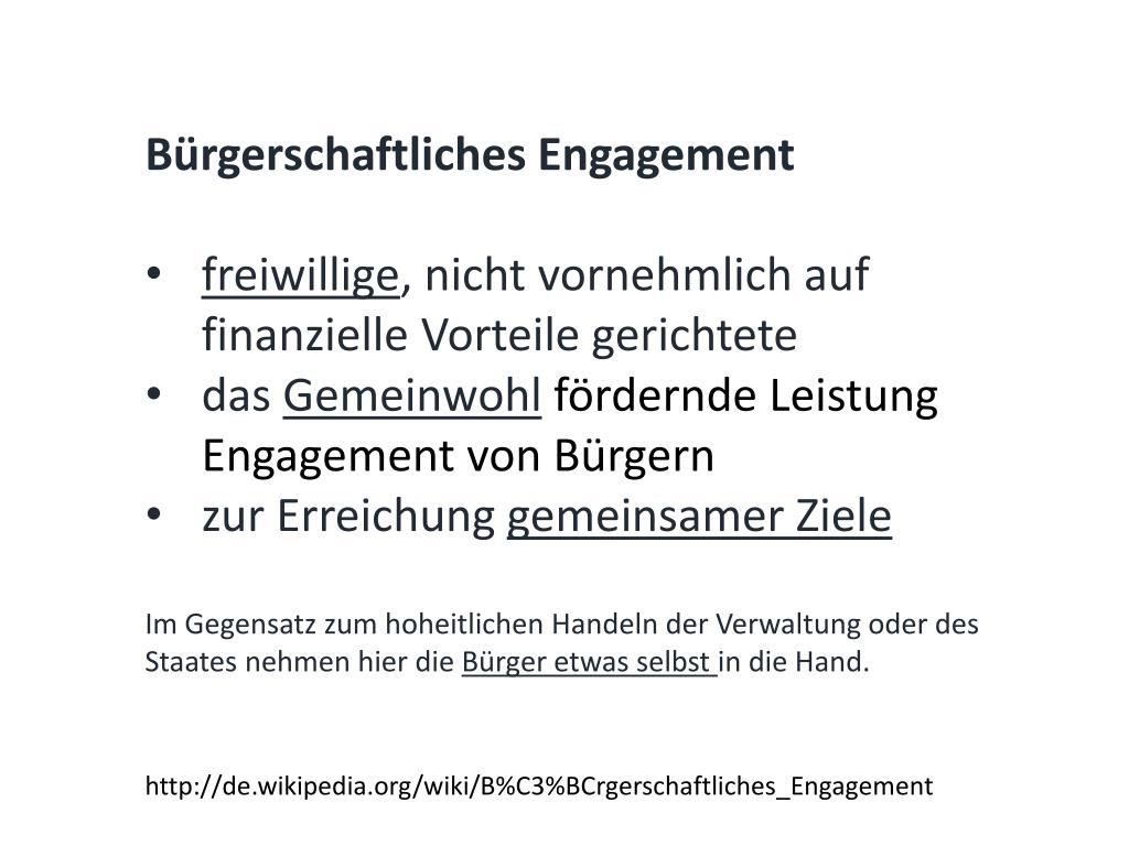 Bürgerschaftliches Engagement • freiwillige, nicht vornehmlich auf finanzielle Vorteile gerichtete • das Gemeinwohlfördernde Leistung Engagement von Bürgern • zur Erreichung gemeinsamer Ziele • Im Gegensatz zum hoheitlichen Handeln der Verwaltung oder des Staates nehmen hier die Bürger etwas selbst in die Hand. http://de.wikipedia.org/wiki/B%C3%BCrgerschaftliches_Engagement