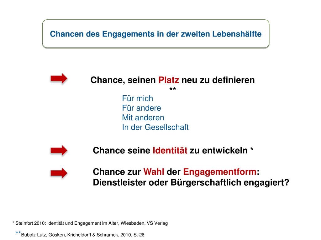 Chancen des Engagements in der zweiten Lebenshälfte Chance, seinen Platz neu zu definieren ** Für mich Für andere Mit anderen In der Gesellschaft Chance seine Identität zu entwickeln * Chance zur Wahl der Engagementform: Dienstleister oder Bürgerschaftlich engagiert? * Steinfort 2010: Identität und Engagement im Alter, Wiesbaden, VS Verlag **Bubolz-Lutz, Gösken, Kricheldorff & Schramek, 2010, S. 26