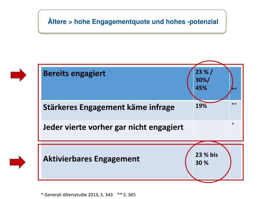 Ältere > hohe Engagementquote und hohes -potenzial * Generali Altersstudie 2013, S. 343 ** S. 365