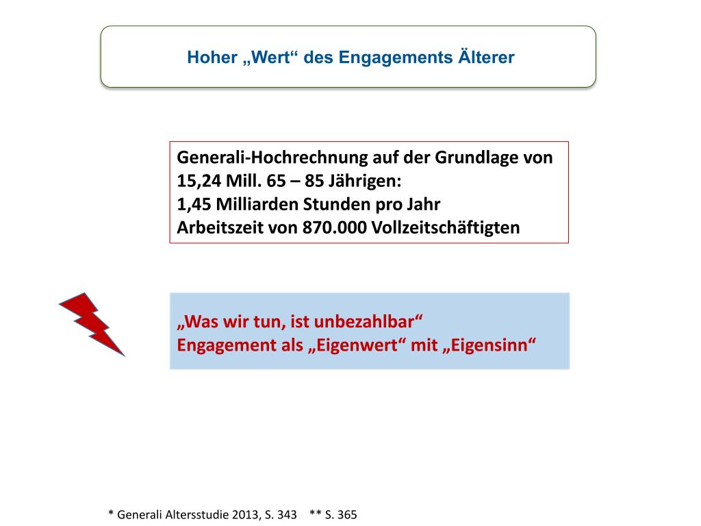 Hoher „Wert“ des Engagements Älterer Generali-Hochrechnung auf der Grundlage von 15,24 Mill. 65 – 85 Jährigen: 1,45 Milliarden Stunden pro Jahr Arbeitszeit von 870.000 Vollzeitschäftigten „Was wir tun, ist unbezahlbar“ Engagement als „Eigenwert“ mit „Eigensinn“ * Generali Altersstudie 2013, S. 343 ** S. 365