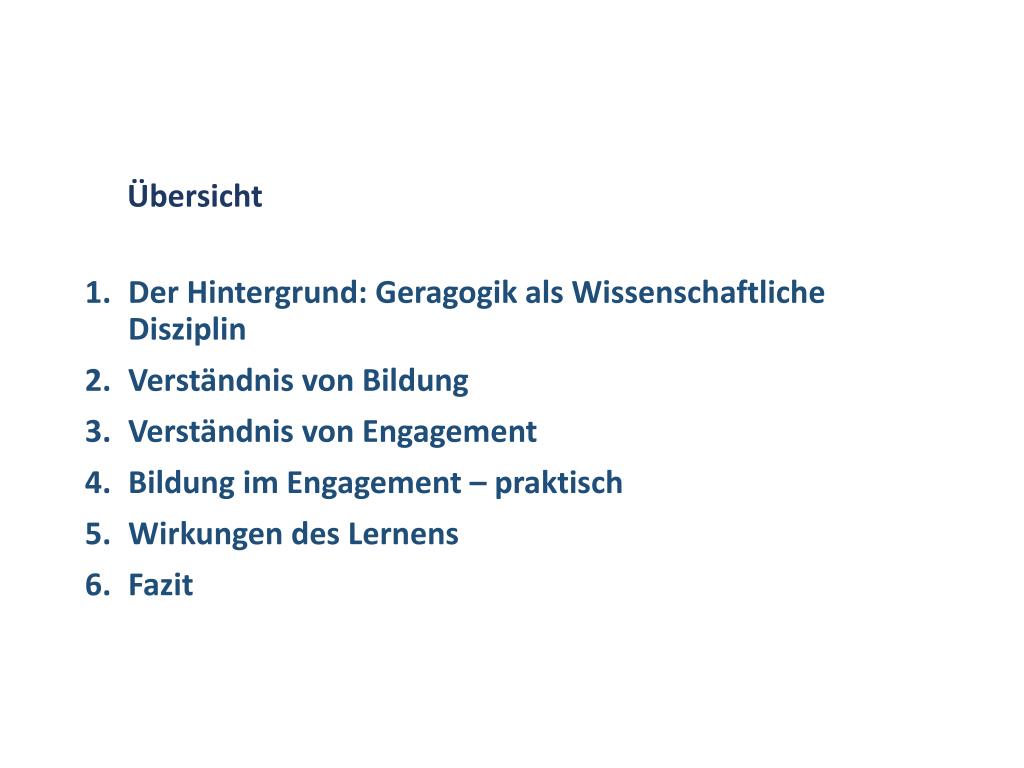 Übersicht • Der Hintergrund: Geragogik als Wissenschaftliche Disziplin • Verständnis von Bildung • Verständnis von Engagement • Bildung im Engagement – praktisch • Wirkungen des Lernens • Fazit