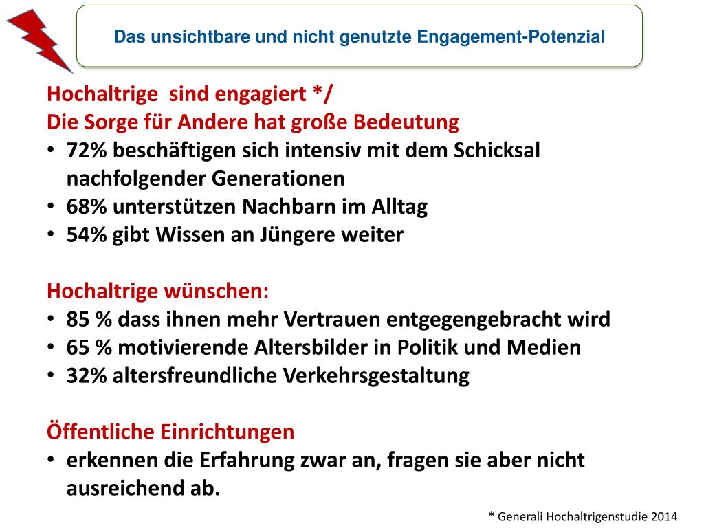 Das unsichtbare und nicht genutzte Engagement-Potenzial • Hochaltrige sind engagiert */ • Die Sorge für Andere hat große Bedeutung • 72% beschäftigen sich intensiv mit dem Schicksal nachfolgender Generationen • 68% unterstützen Nachbarn im Alltag • 54% gibt Wissen an Jüngere weiter • Hochaltrigewünschen: • 85 % dass ihnen mehr Vertrauen entgegengebracht wird • 65 % motivierende Altersbilder in Politik und Medien • 32% altersfreundliche Verkehrsgestaltung • Öffentliche Einrichtungen • erkennen die Erfahrung zwar an, fragen sie aber nicht ausreichend ab. * GeneraliHochaltrigenstudie 2014