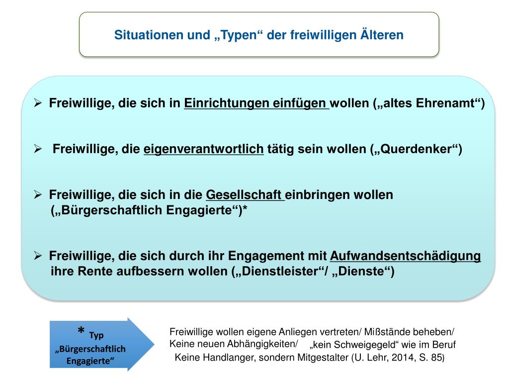 Situationen und „Typen“ der freiwilligen Älteren • Freiwillige, die sich in Einrichtungen einfügen wollen („altes Ehrenamt“) • Freiwillige, die eigenverantwortlich tätig sein wollen („Querdenker“) • Freiwillige, die sich in die Gesellschaft einbringen wollen • („Bürgerschaftlich Engagierte“)* • Freiwillige, die sich durch ihr Engagement mit Aufwandsentschädigung • ihre Rente aufbessern wollen („Dienstleister“/ „Dienste“) * Typ „Bürgerschaftlich Engagierte“ Freiwillige wollen eigene Anliegen vertreten/ Mißstände beheben/ Keine neuen Abhängigkeiten/ „kein Schweigegeld“ wie im Beruf Keine Handlanger, sondern Mitgestalter (U. Lehr, 2014, S. 85)