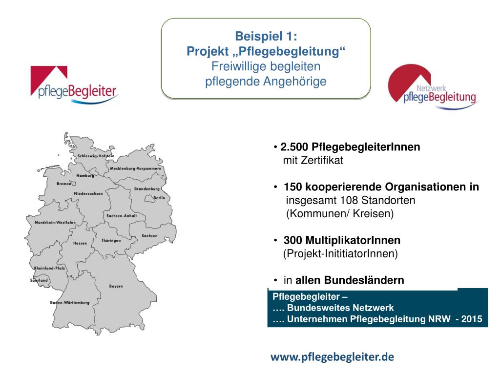 Beispiel 1: Projekt „Pflegebegleitung“ Freiwillige begleiten pflegende Angehörige • 2.500 PflegebegleiterInnen • mit Zertifikat • 150 kooperierende Organisationen in • insgesamt 108 Standorten • (Kommunen/ Kreisen) • 300 MultiplikatorInnen • (Projekt-InititiatorInnen) • in allen Bundesländern Pflegebegleiter – …. Bundesweites Netzwerk …. Unternehmen Pflegebegleitung NRW - 2015 www.pflegebegleiter.de