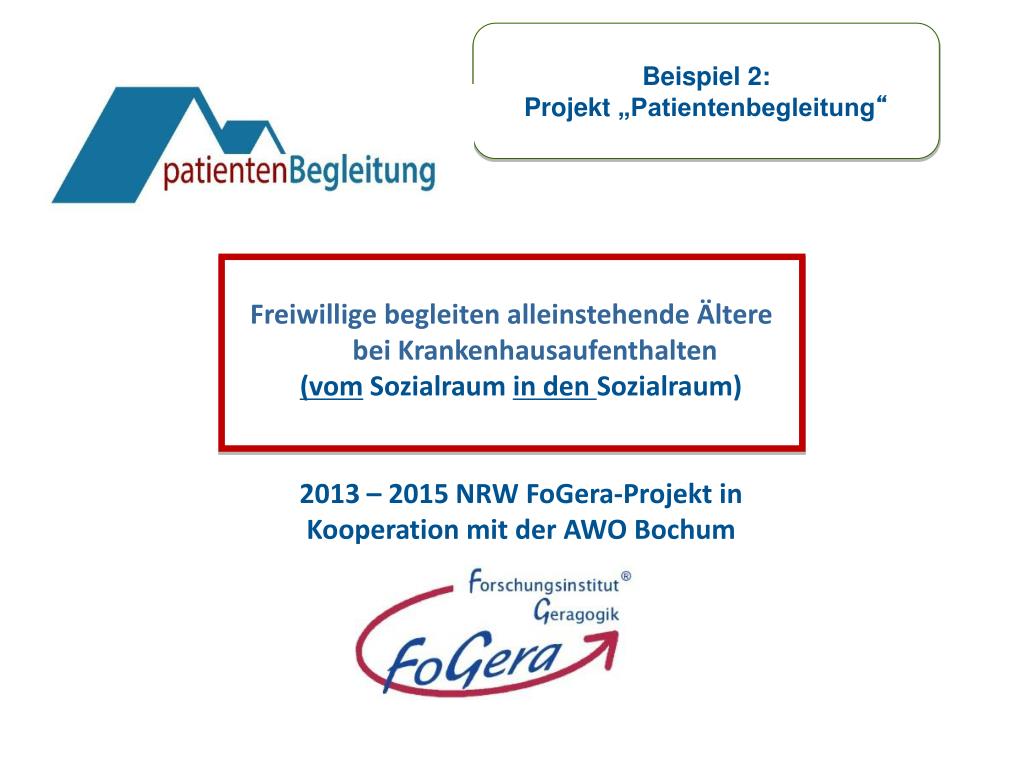 Beispiel 2: Projekt „Patientenbegleitung“ Freiwillige begleiten alleinstehende Ältere bei Krankenhausaufenthalten (vom Sozialraum in den Sozialraum) 2013 – 2015 NRW FoGera-Projekt in Kooperation mit der AWO Bochum